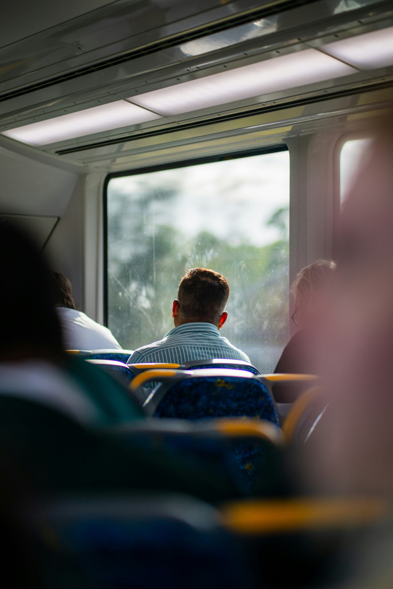 A person in a bus/train seat is seen from behind. Photo: Matthew Alexander/Unsplash